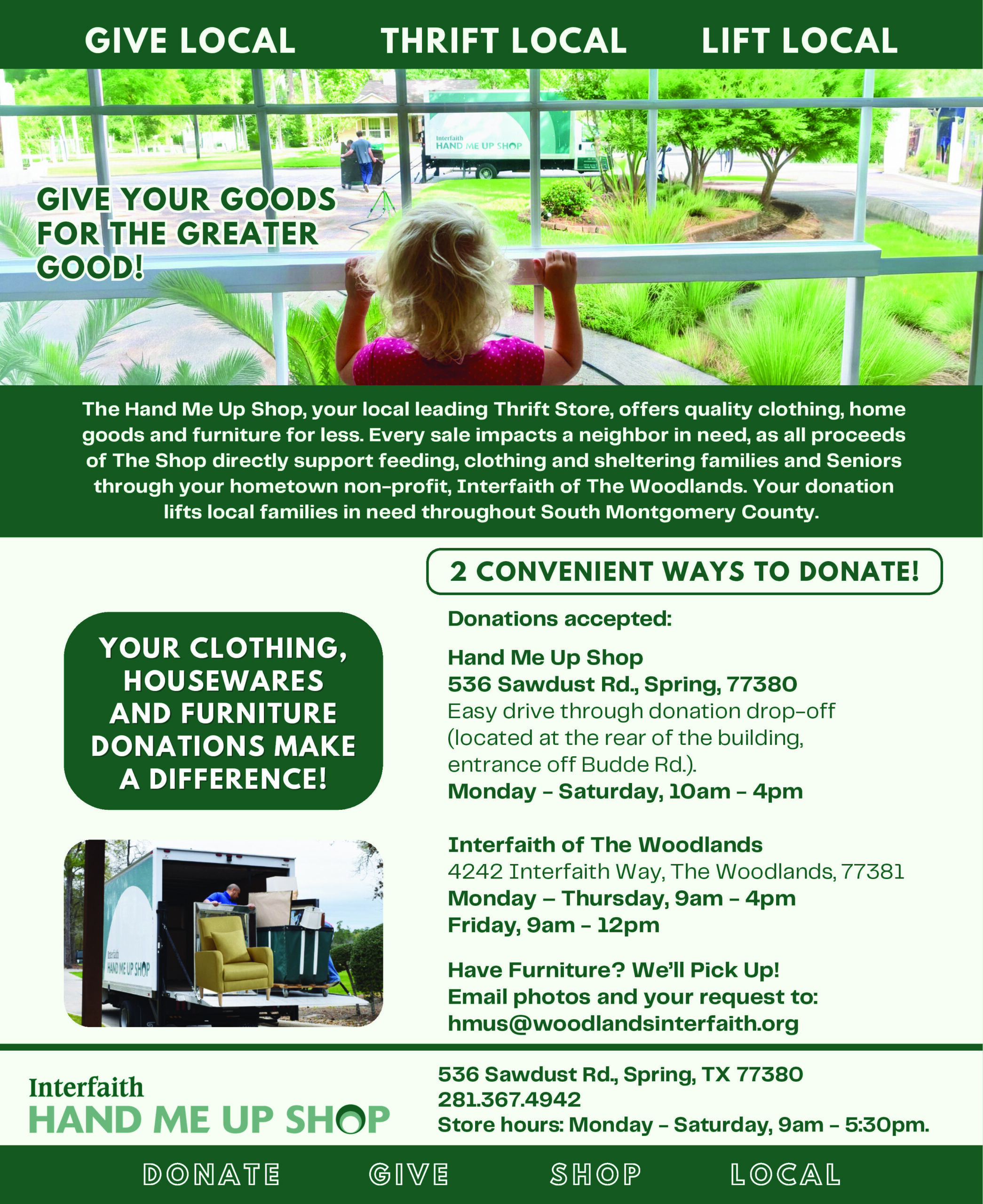 Veggie Village, community donation gardens, are welcoming places where people work and learn together while providing fresh organic produce to the Interfaith Food Pantry and Senior Living Complexes. The gardens are located at the Alden Bridge Sports Park and Wendtwoods Park (in the Village of Creekside) in partnership with The Woodlands Township and many community volunteers.